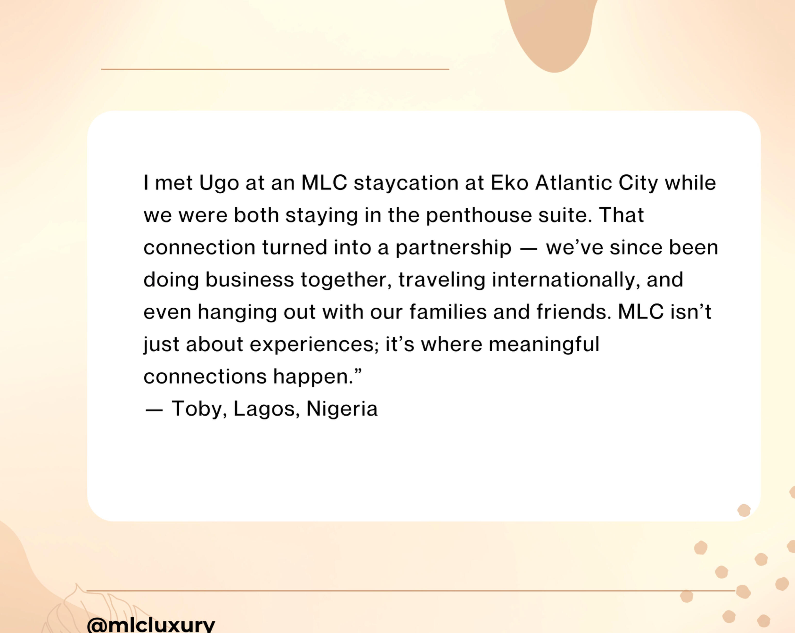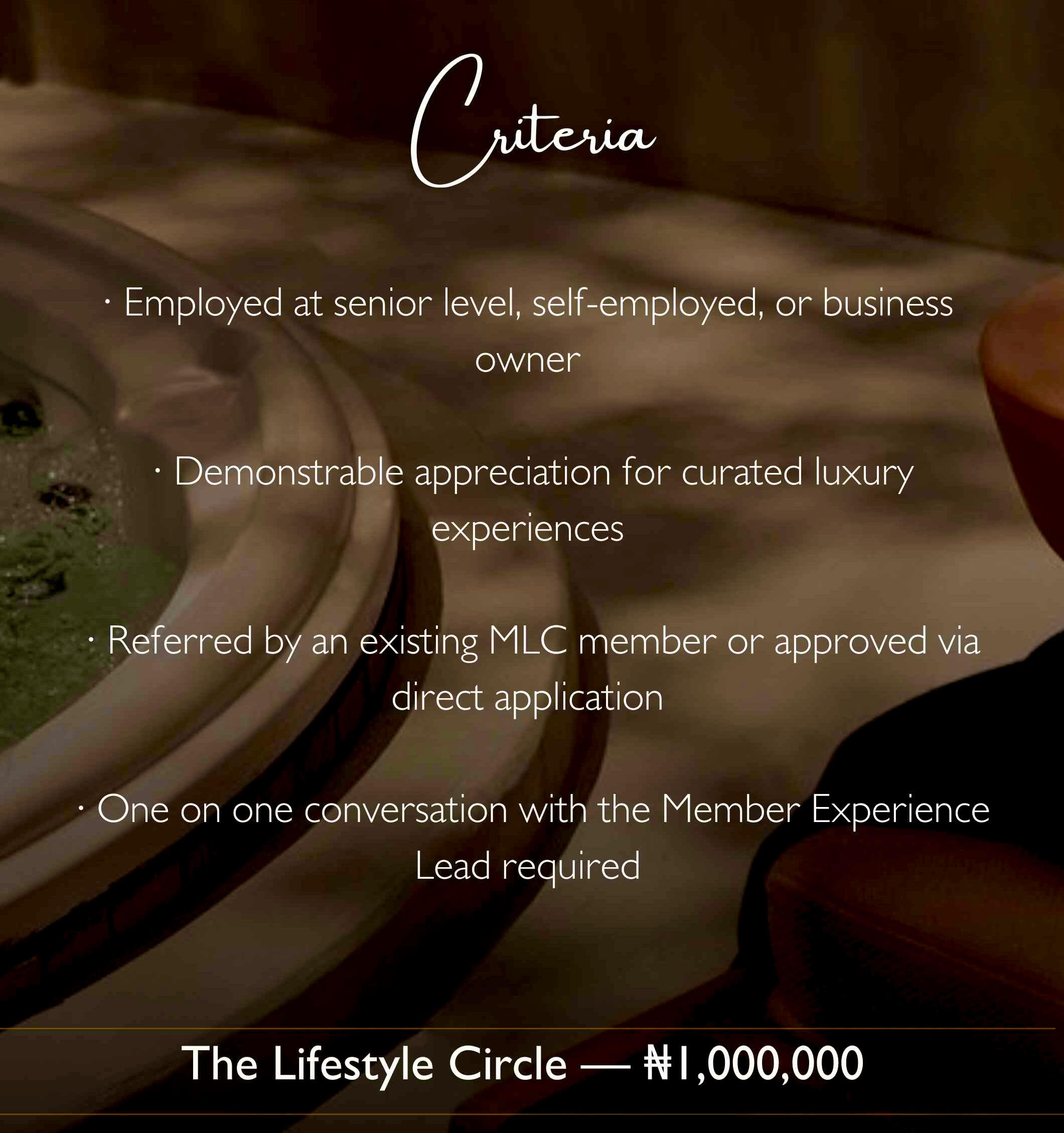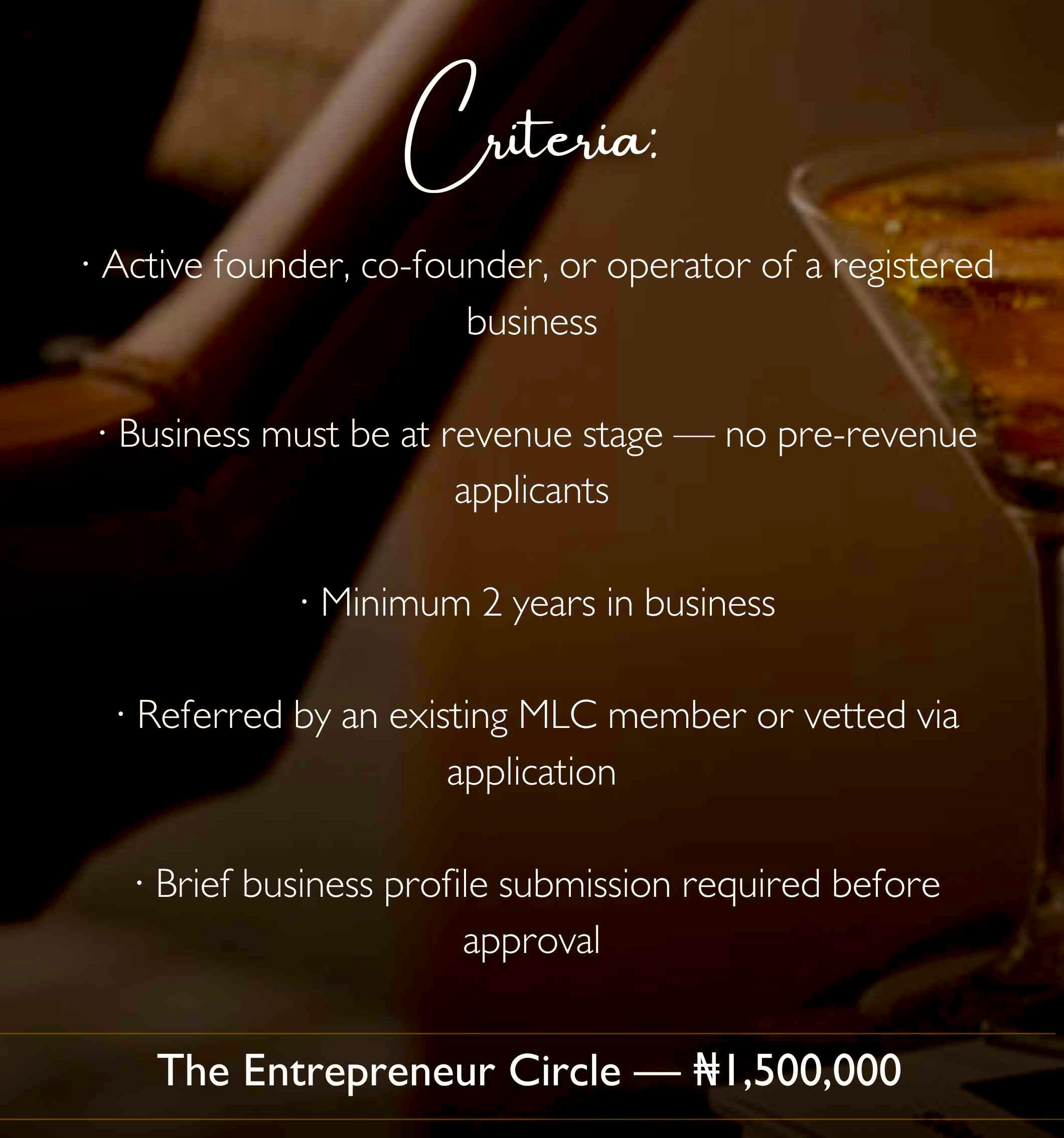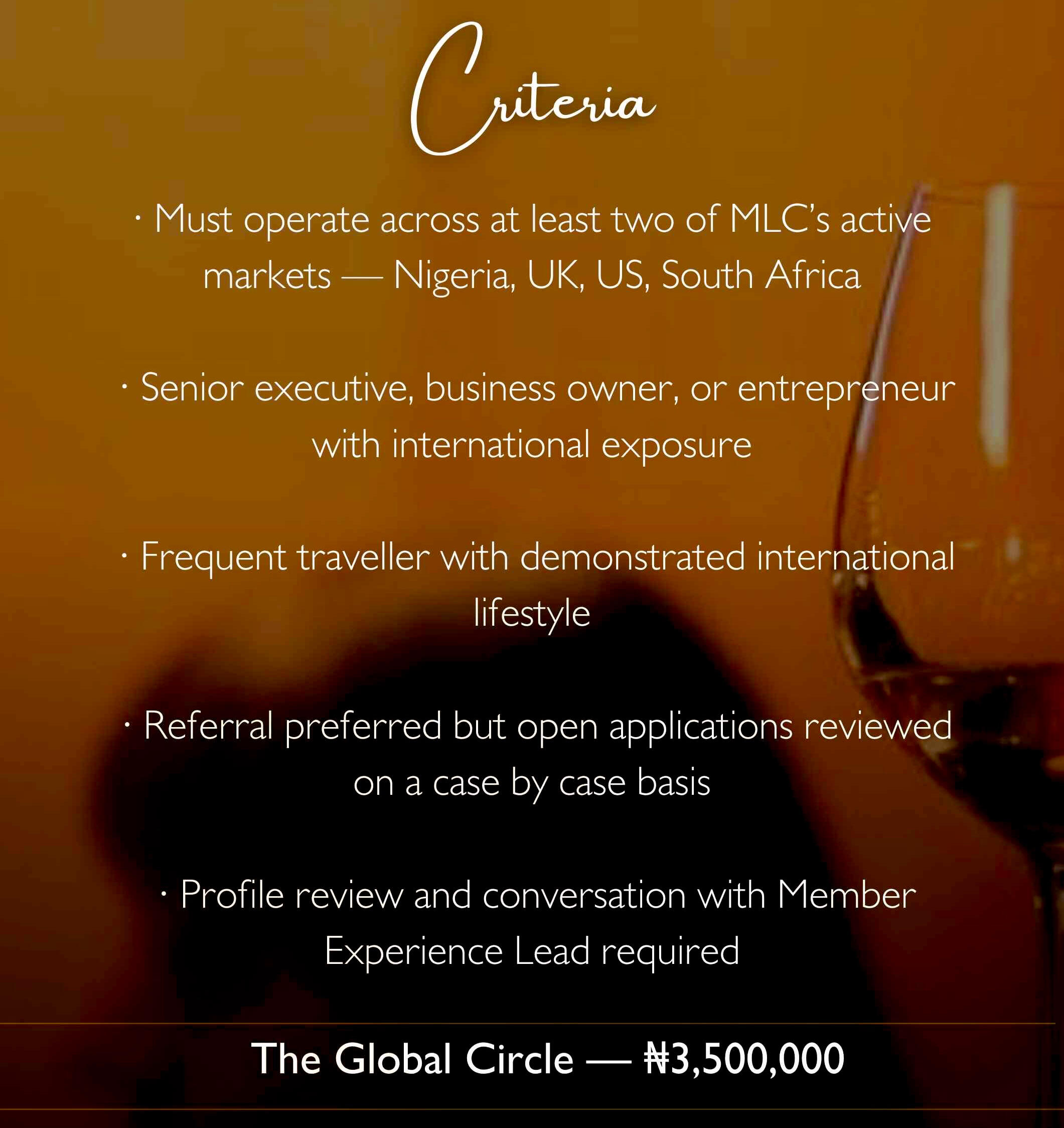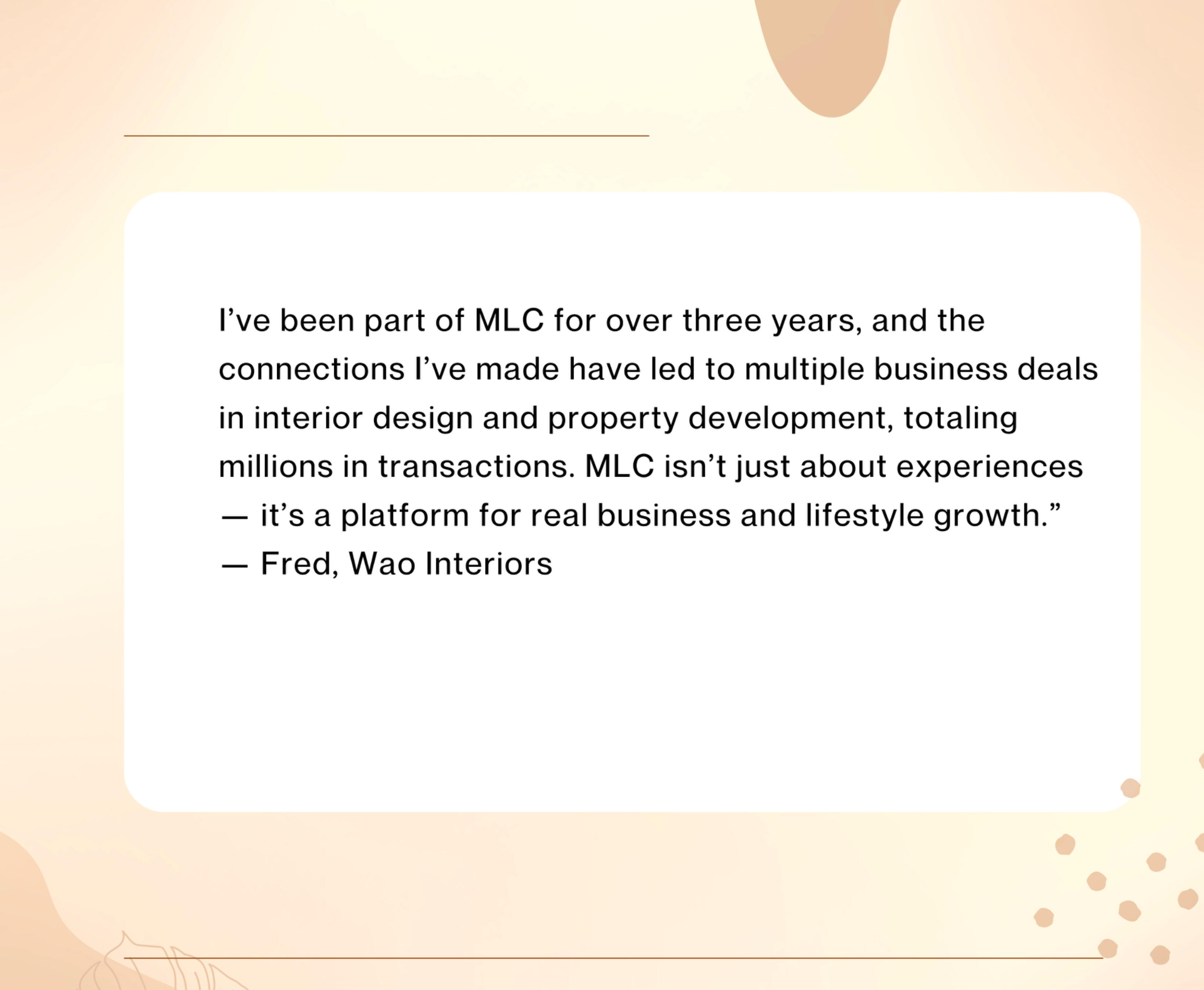 Every circle is different. One thing never changes.Regardless of which circle you belong to, the MLC standard remains constant — the quality of curation, the calibre of people in the room, and the level of experience delivered.We do not dilute access. We do not compromise on who sits at our table. That standard is what makes MLC worth belonging to.