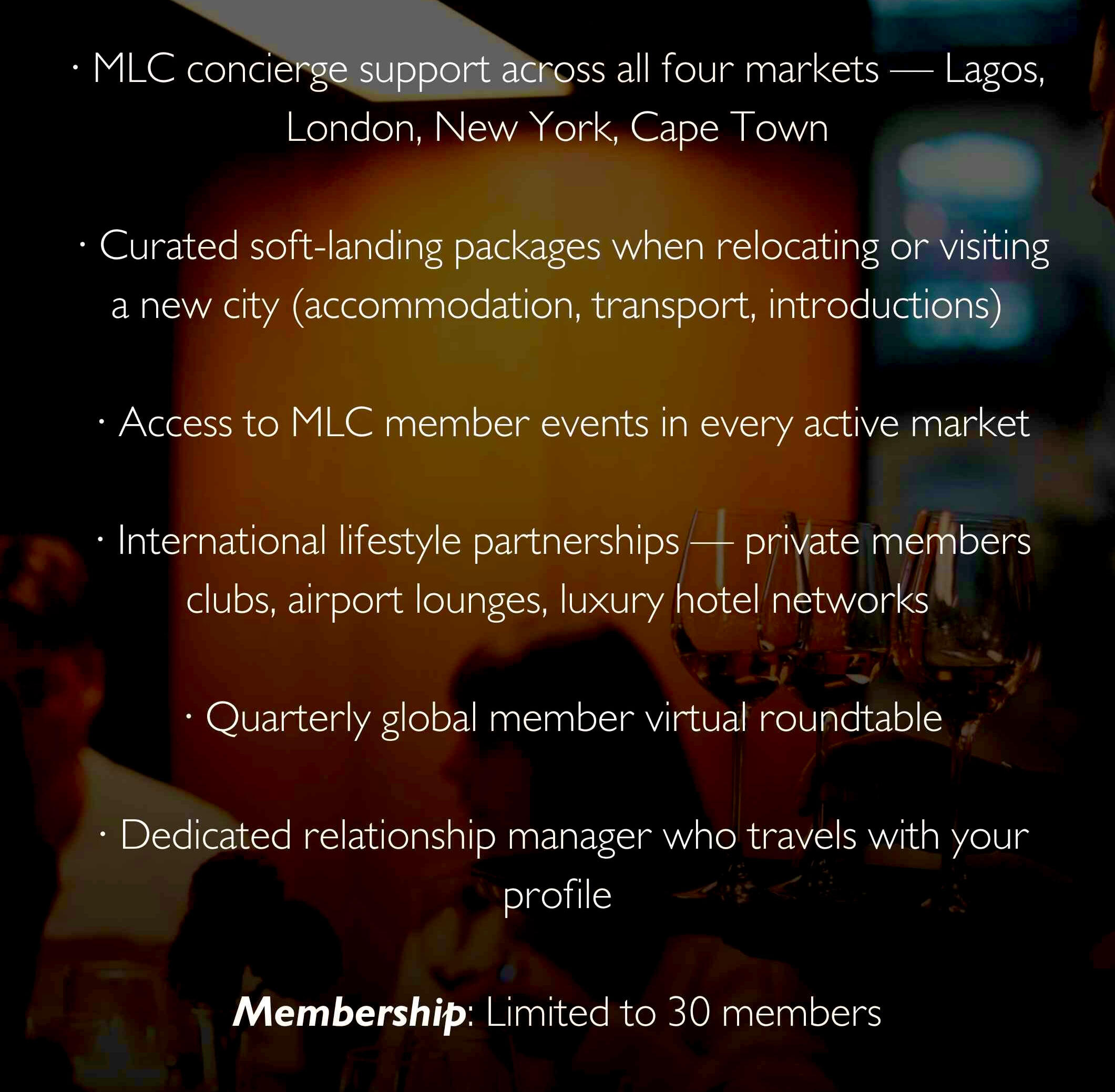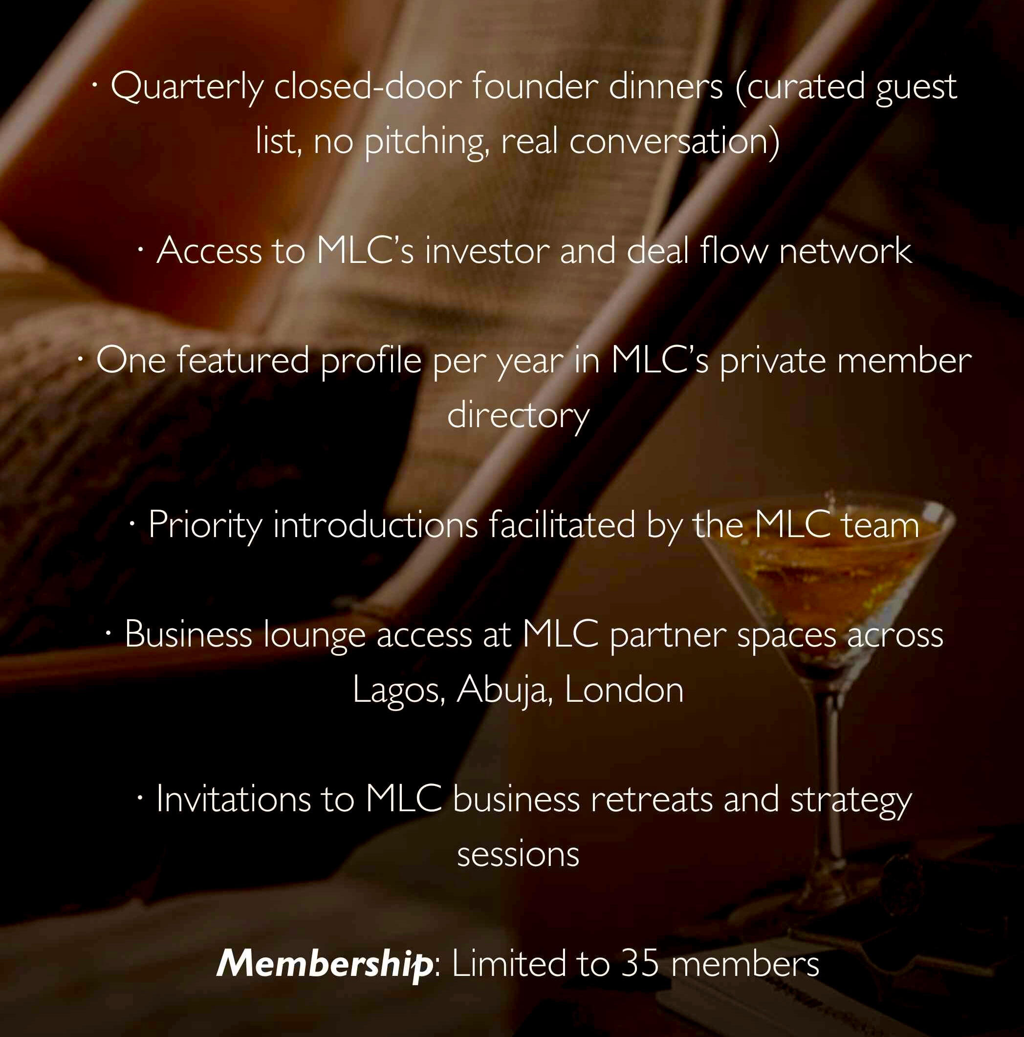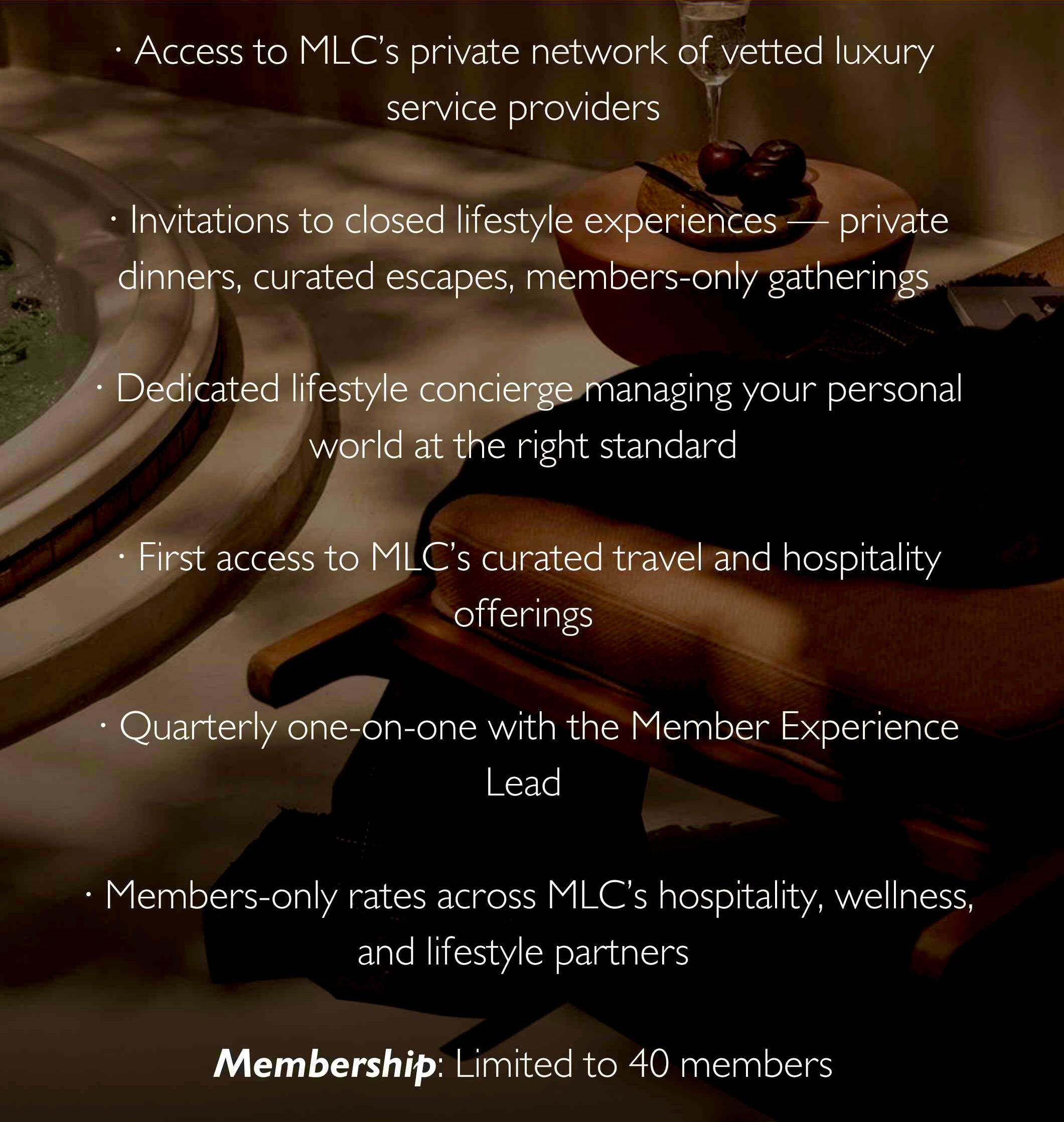 MLC gathers its members in rooms most people never see.Private dinners. Curated escapes. Closed conversations.Our events are not ticketed. They are not open to the public. They are curated for members and selected guests — by invitation only.