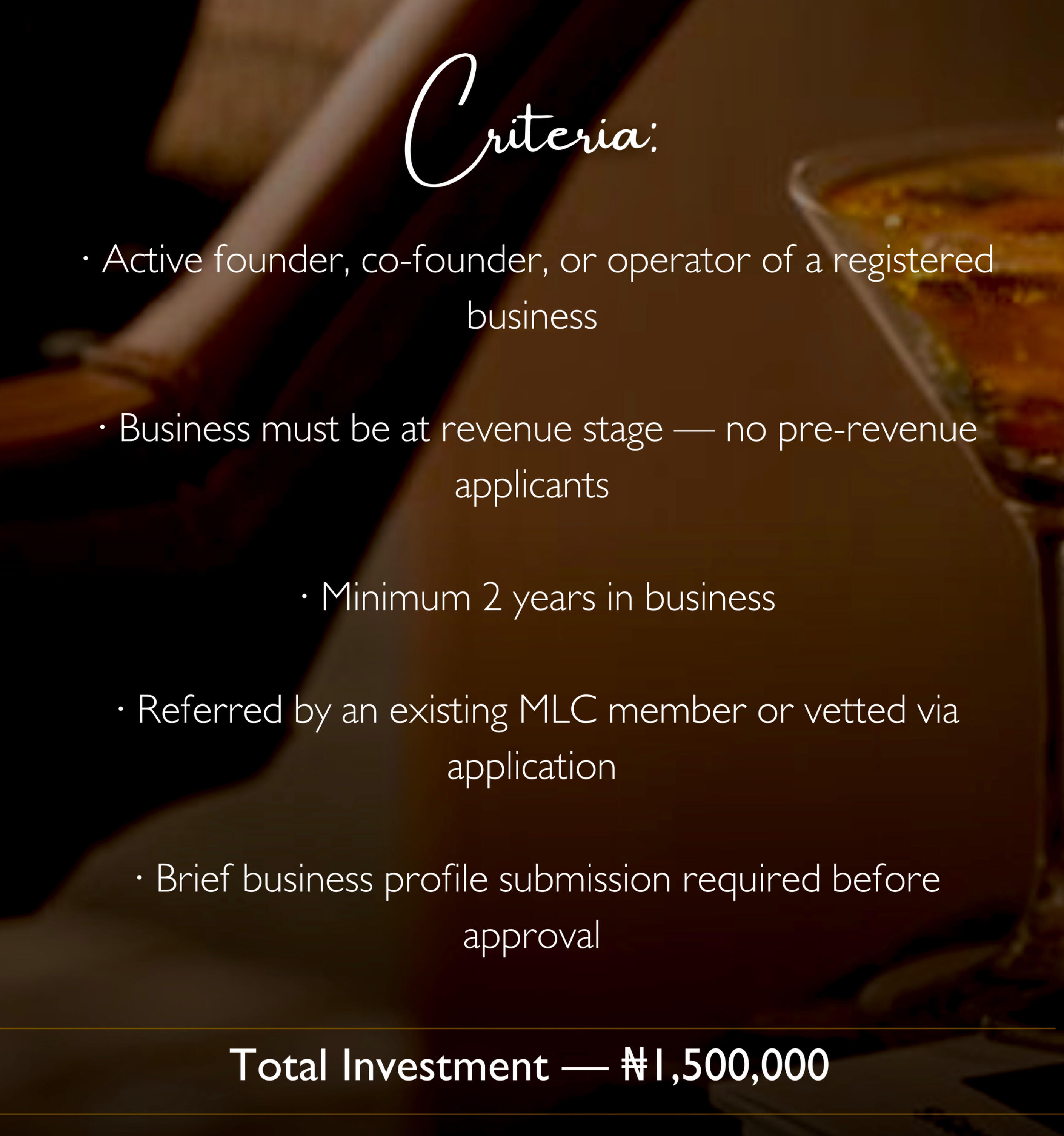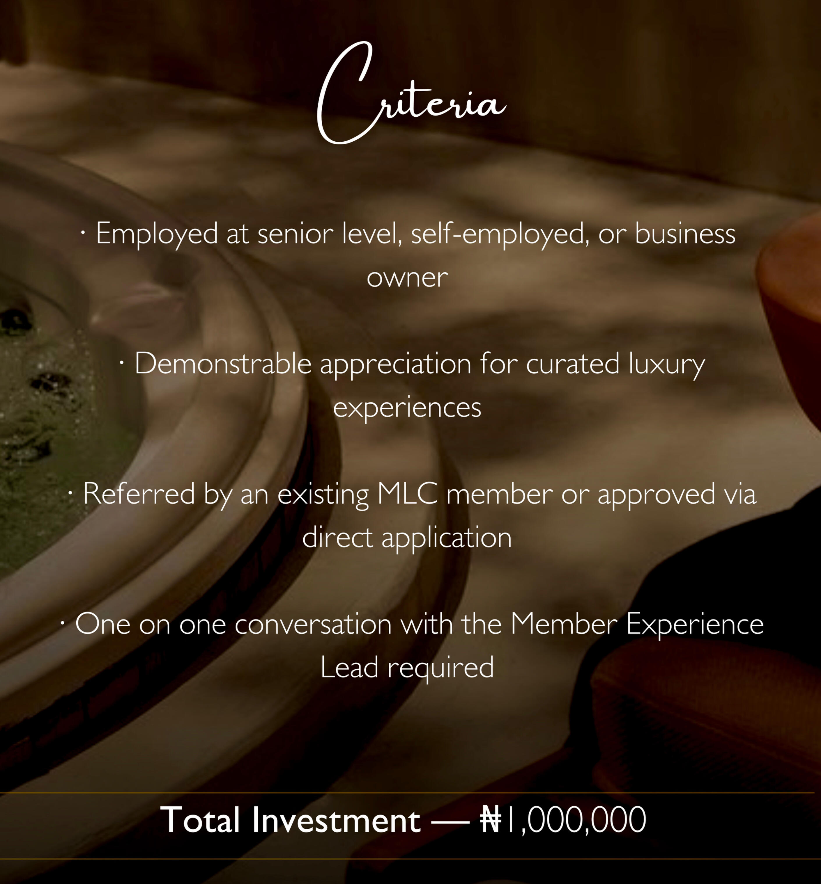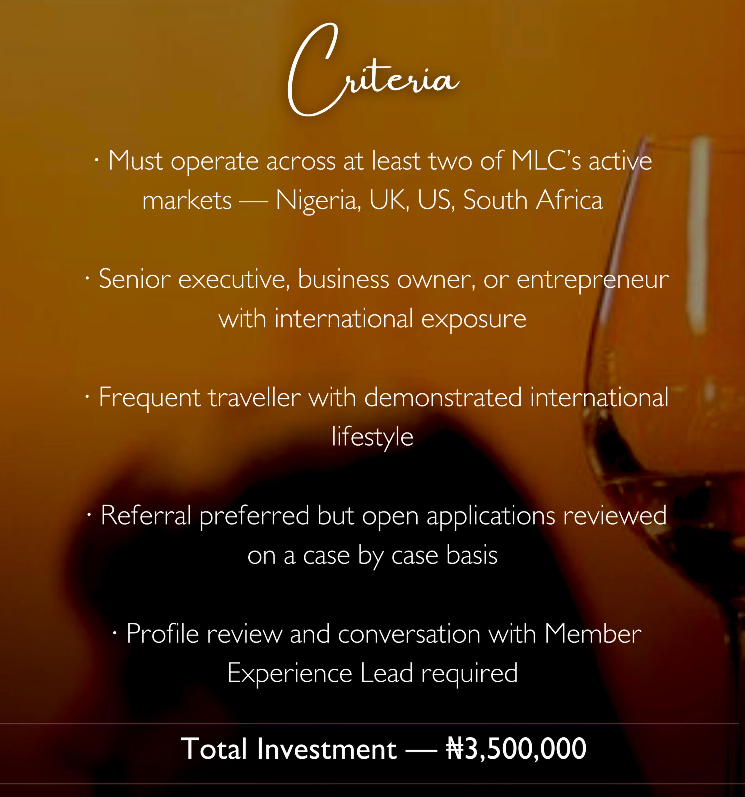 Every circle is different. One thing never changes.Regardless of which circle you belong to, the MLC standard remains constant — the quality of curation, the calibre of people in the room, and the level of experience delivered.We do not dilute access. We do not compromise on who sits at our table. That standard is what makes MLC worth belonging to.