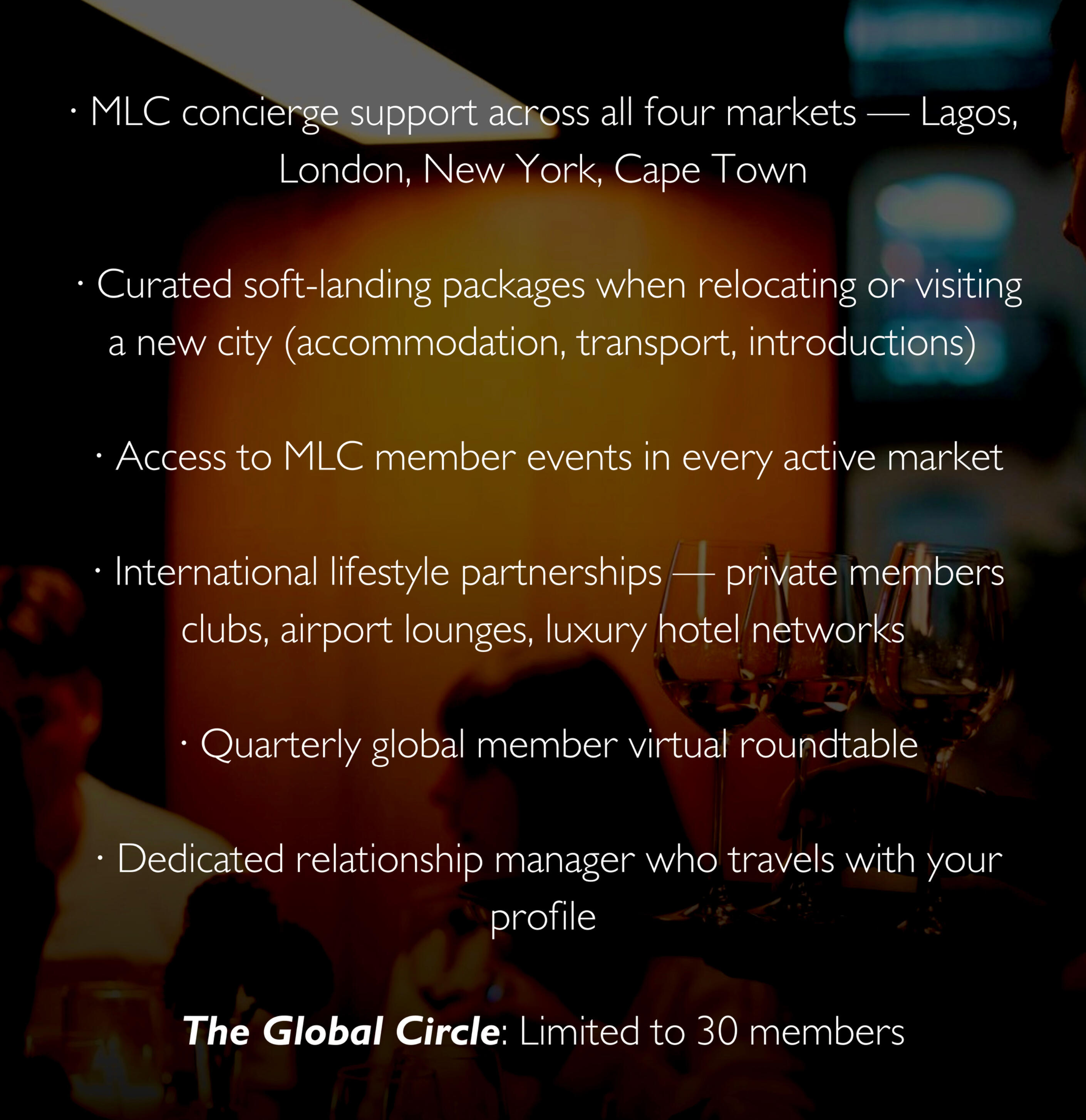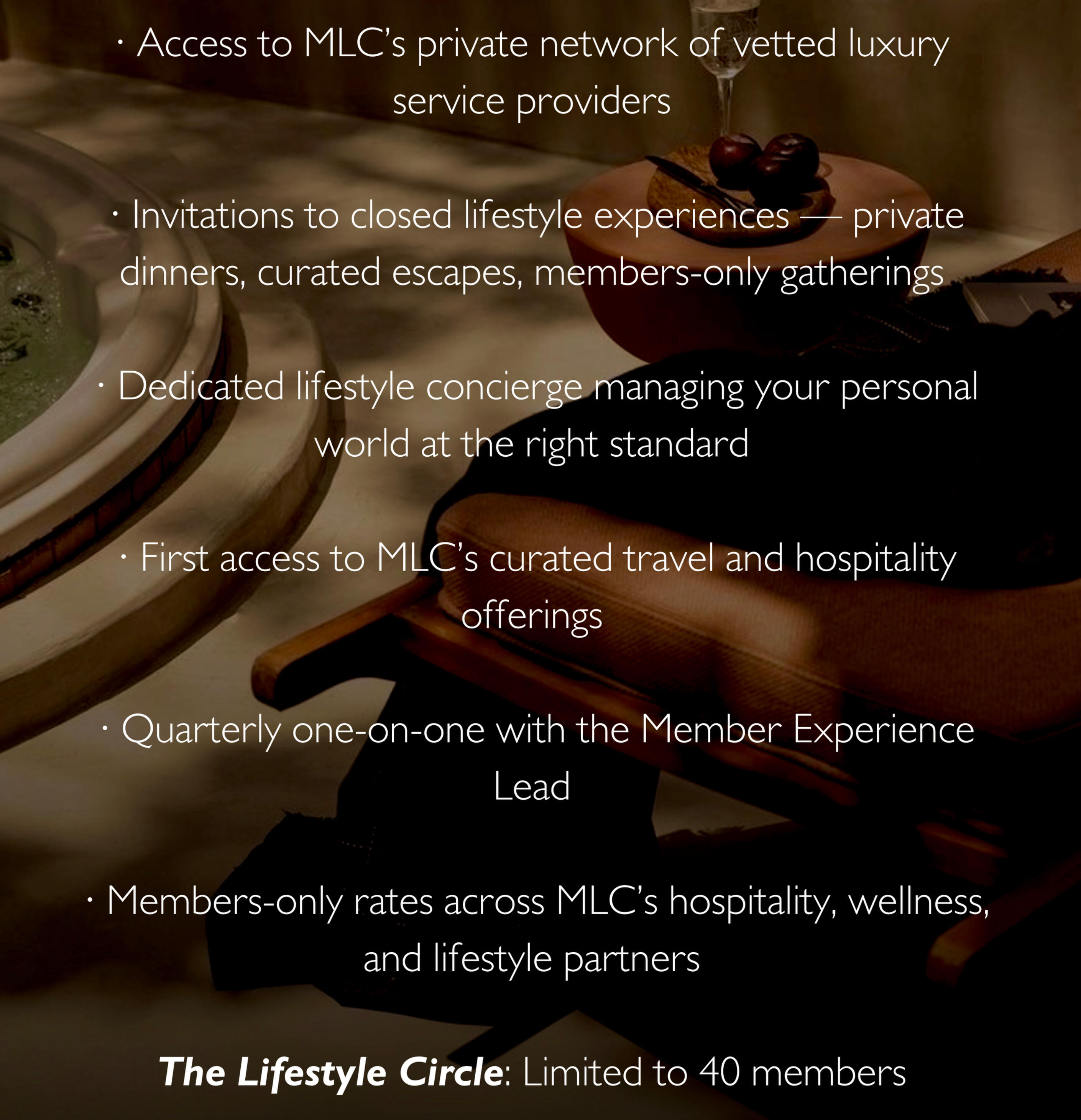 MLC gathers its members in rooms most people never see.Private dinners. Curated escapes. Closed conversations.Our events are not ticketed. They are not open to the public. They are curated for members and selected guests — by invitation only.